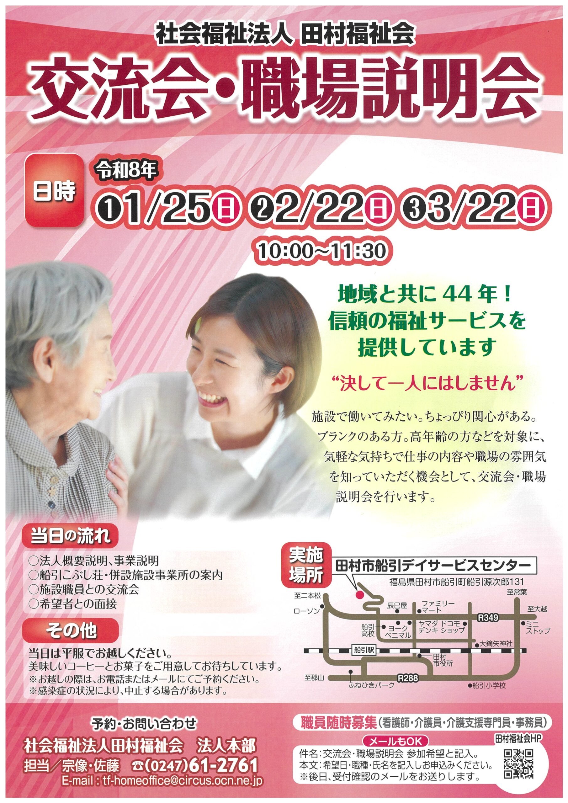 2026.01.13 お知らせ 交流会・職場説明会(R8.1・2・3月)の開催 について 交流会・職場説明会を下記の日程で実施します。 皆さまのご参加を心よりお待ちしております。 交流会・職場説明会R8.1・2・3月