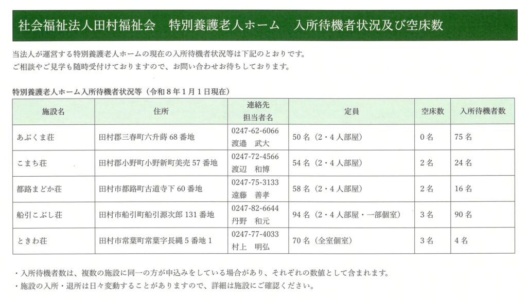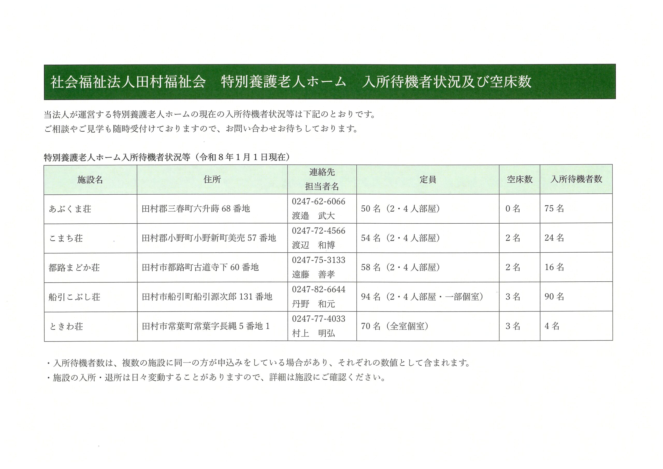 田村福祉会 各特別養護老人ホームの入所待機者状況及び空床数をお知らせいたします。
