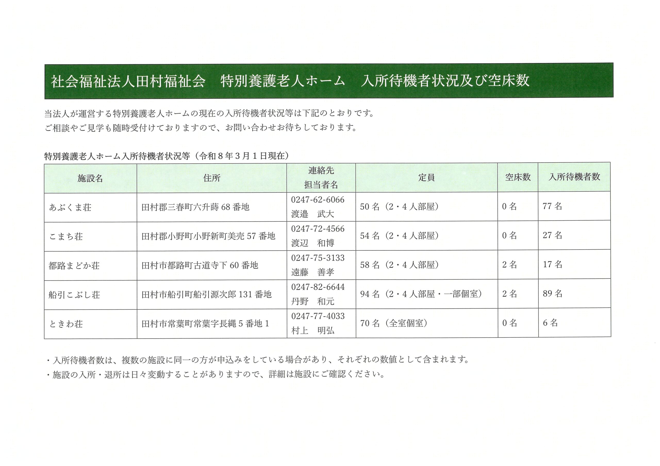 2026.03.13 お知らせ 田村福祉会 入所待機者状況及び空床数(R8.3.1現在) 田村福祉会 各特別養護老人ホームの入所待機者状況及び空床数をお知らせいたします。 入所待機者状況及び空床数(R8.3.1)